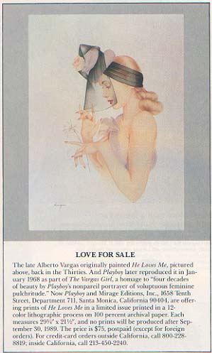 Mirage Edition 1988-89 29 1/4 X 21 1/2 The late Alberto Vargas originally painted "He Loves Me", pictured here, back in the Thirties. And Playboy later reproduced it in January 1968 as part of "The Vargas Girl" homage to "four decades of beauty by Playboy's nonpareil portrayer of voluptuous feminine pulchritude. Playboy and Mirage Editions offered this print of "He Loves Me" in a limited issue printed in a 12-color lithographic process on 100 percent archival paper. Each measures 29¼" x 21½", and no more prints were produced after after September 30, 1989. (Lithographic Print) "Out-of-Print" No Longer Available" |